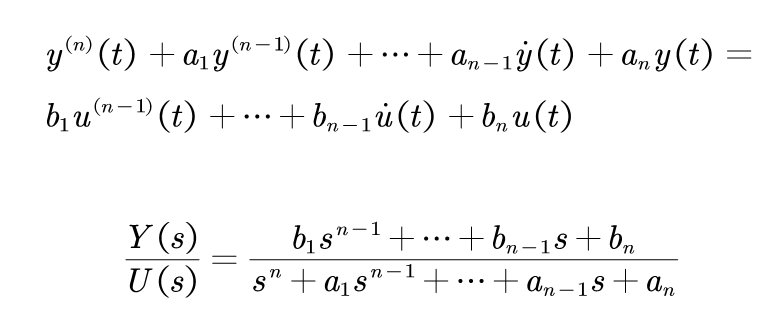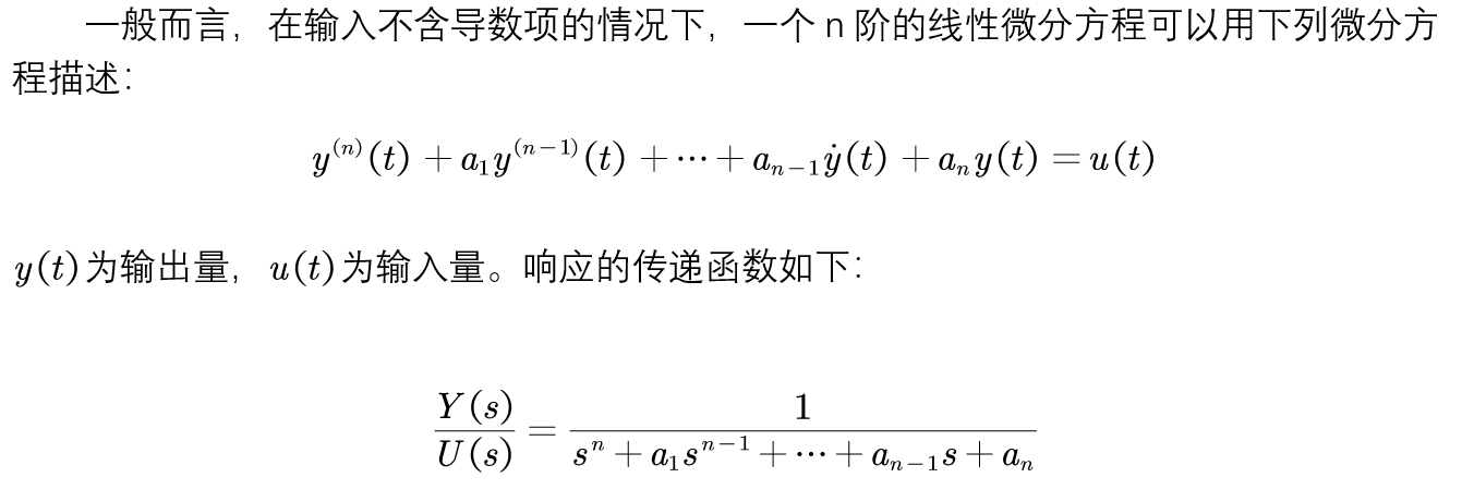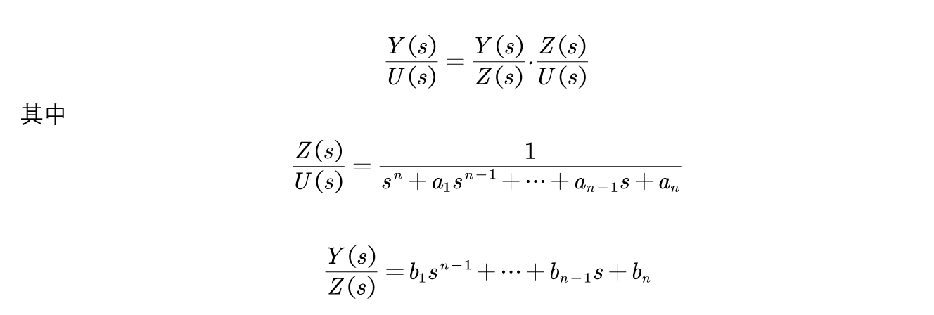 输入含有导数项的微分方程在不仅求解上复杂,而且在物理实现上也存在麻烦,故希望选取合适的状态变量使得状态方程中不含输入函数的导数项。输入含有导数项的微分方程与传递函数如下: