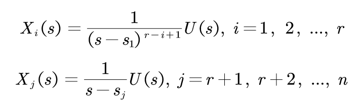 X k ( s ) = 1 ( s − s 1 ) r − k + 1 U ( s ) = 1 s − s 1 X k + 1 ( s ) X_kleft( s right) =frac{1}{left( s-s_1 right) ^{r-k+1}}Uleft( s right) =frac{1}{s-s_1}X_{k+1}left( s right) Xk(s)=(s−s1)r−k+11U(s)=s−s11Xk+1(s)