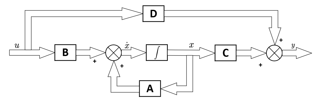 状态空间表达式的系统框图:用于表示系统信号的传递关系,单线箭头表示标量信号,双线箭头表示矢量信号。