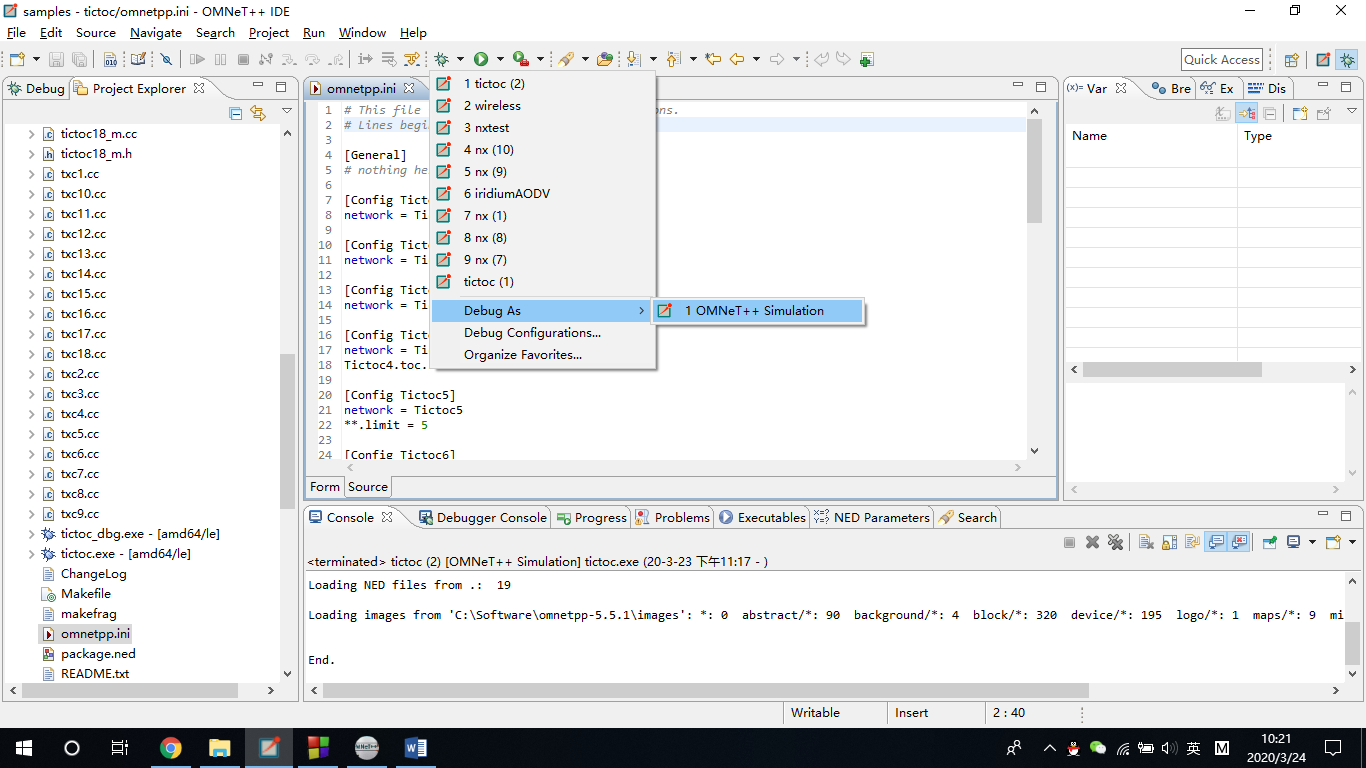 1. 先确保.ini可以运行,然后点击debug下拉菜单的omnet++ simulation