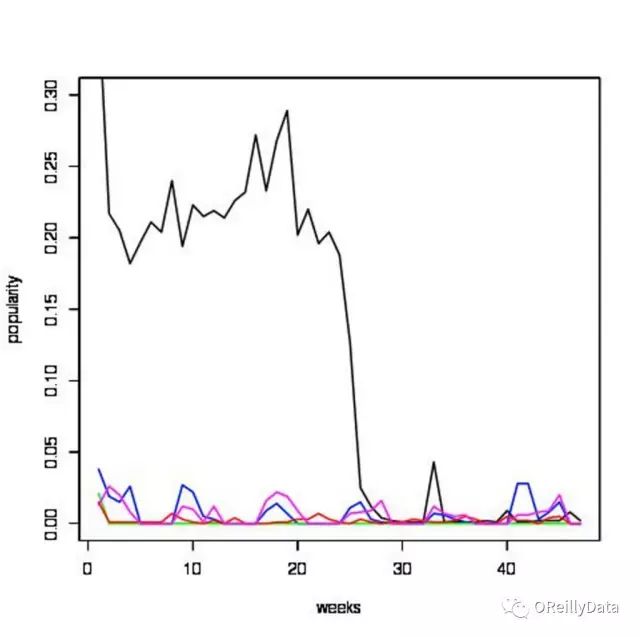 图一展示了随机数据集在2014年每周的流行度,Y轴使用的是对数刻度。每一条线代表了不同的数据集。由黑线代表的数据集在第1到20周比其他多20%-30%的访问,表明该数据集的流行和普及。相较而言,黄线代表的数据集根本没有被访问,表明该数据集是不流行的。