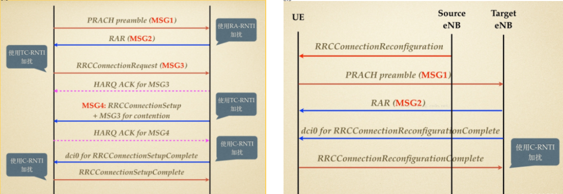 4.4 切换。与目标站需要上行同步。crnti不变,原则上可以使用非竞争接入。源站可以将非竞争的preamble码通过RRCConnectionReconfiguration发给UE。也可以竞争接入...