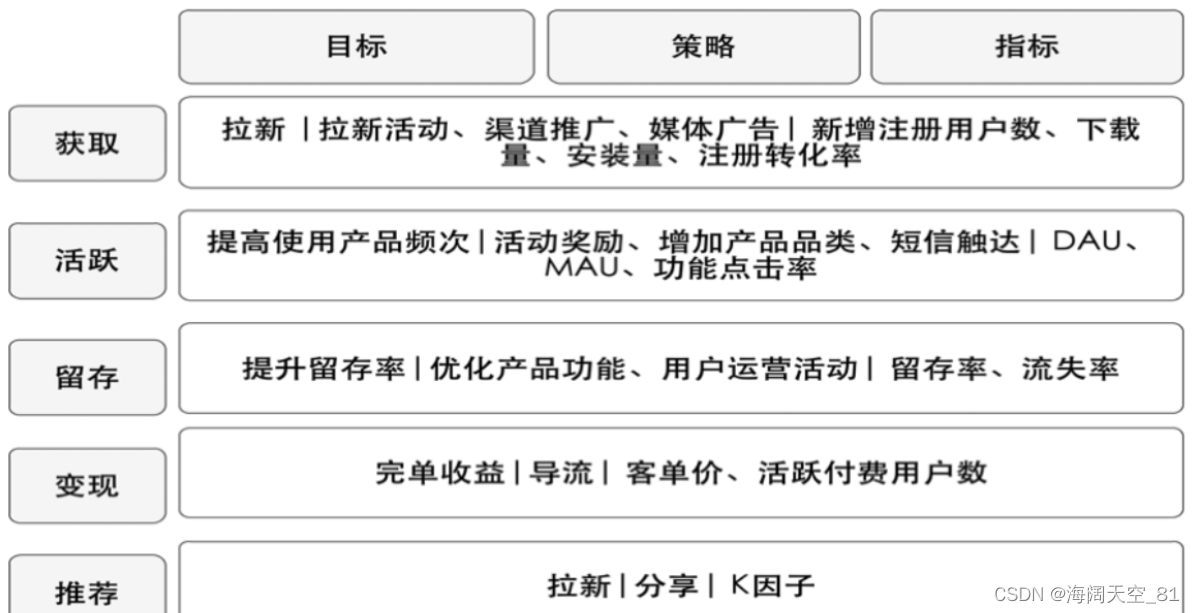 通过各种推广渠道,以各种方式获取目标用户,并对各种营销渠道的效果评估,不断优化投入策略,降低获客成本。涉及关键指标例如新增注册用户数、激活率、注册转化率、新客留存率、下载量、安装量等。