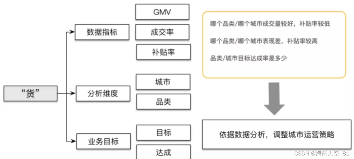 从“货”的视角,我们比较关心的就是成交了多少,交易额多少,花了多少,到具体数据指标主要会看GMV、成交率、取消率指标,在进一步会细分到城市、区域,一级品类、二级品类。数据的效果通过目标对比,横向对比、历史比较等方式进行分析确定。