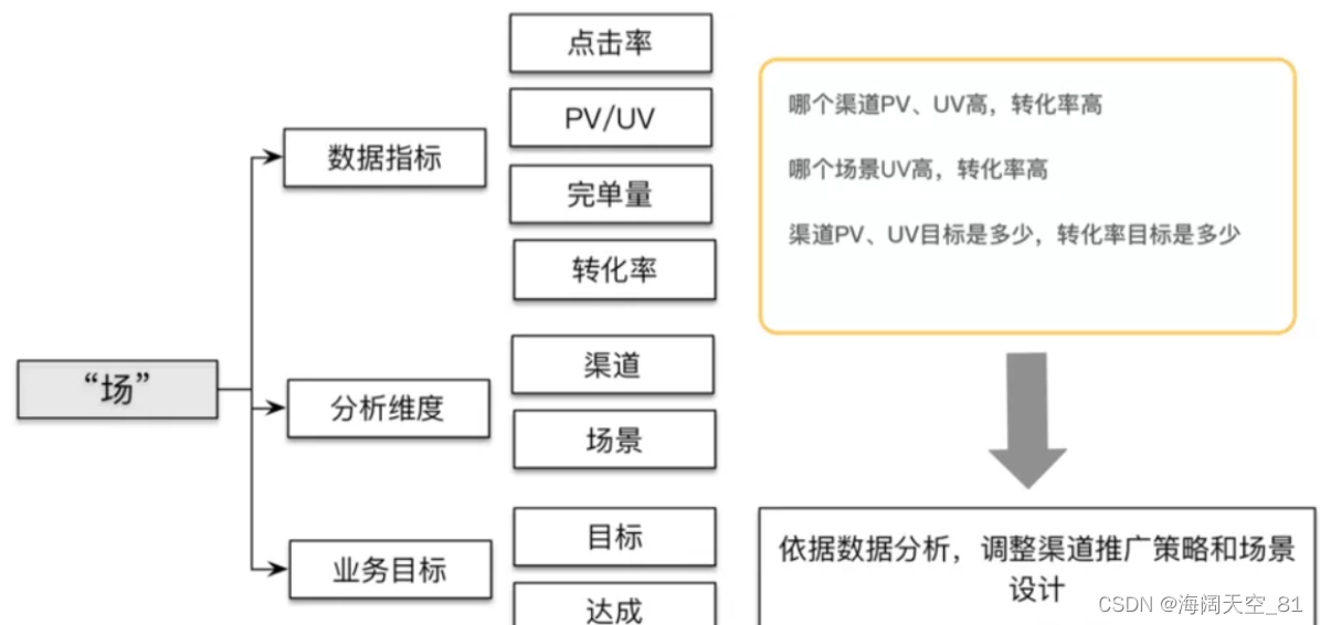 从“场”的视角,我们比较关心的就是哪个渠道用户点击量大曝光率大,带来了多少新用户,完成多少交易订单,客单价是多少;或者是哪个活动拉新或促活效果怎么样转化率多少,结合场景数据实际情况制定对应策略。