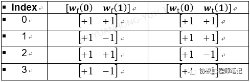 表示某个CDM类型的时/频域的OCC,以确保复用该RE的某个CDM Group内的端口正交。比如CDM4-FD2-TD2对应如下(38.211 - Table 7.4.1.5.3-4):