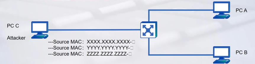 - 泛洪攻击即是攻击者利用这种学习机制不断发送不同的MAC地址给交换机,填满这个MAC地址表,此时的交换机只能进行数据广播,攻击者凭此获得信息。
