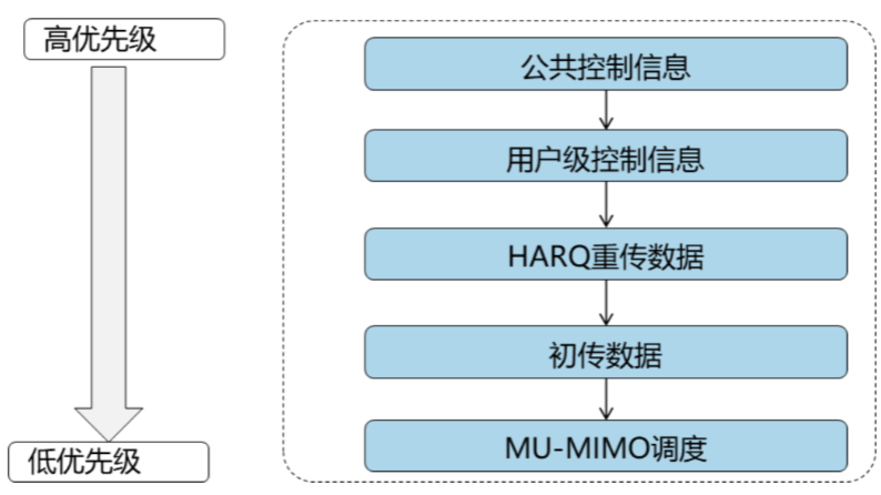 广播消息、寻呼和随机接入响应等公共控制消息在每个slot中具有最高优先级,因此不存在下行调度资源不足的情况。在完成公共控制消息的调度后,下行调度首先获取可调度资源,然后按照HARQ等待时间的长短进行重传数据和初始数据的调度,最后针对MU-MIMO配对用户进行调度。
