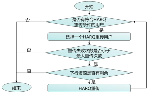 - 判断是否满足HARQ重传条件:重传调度模块通过判断当前用户是否已经进行初传调度,判断是否将重传用户加入当前的重传调度队列;