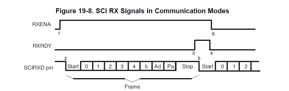6.位RXENA变为低电平以禁用接收器。数据继续在RXSHF中组装,但不会传输到接收器缓冲寄存器。