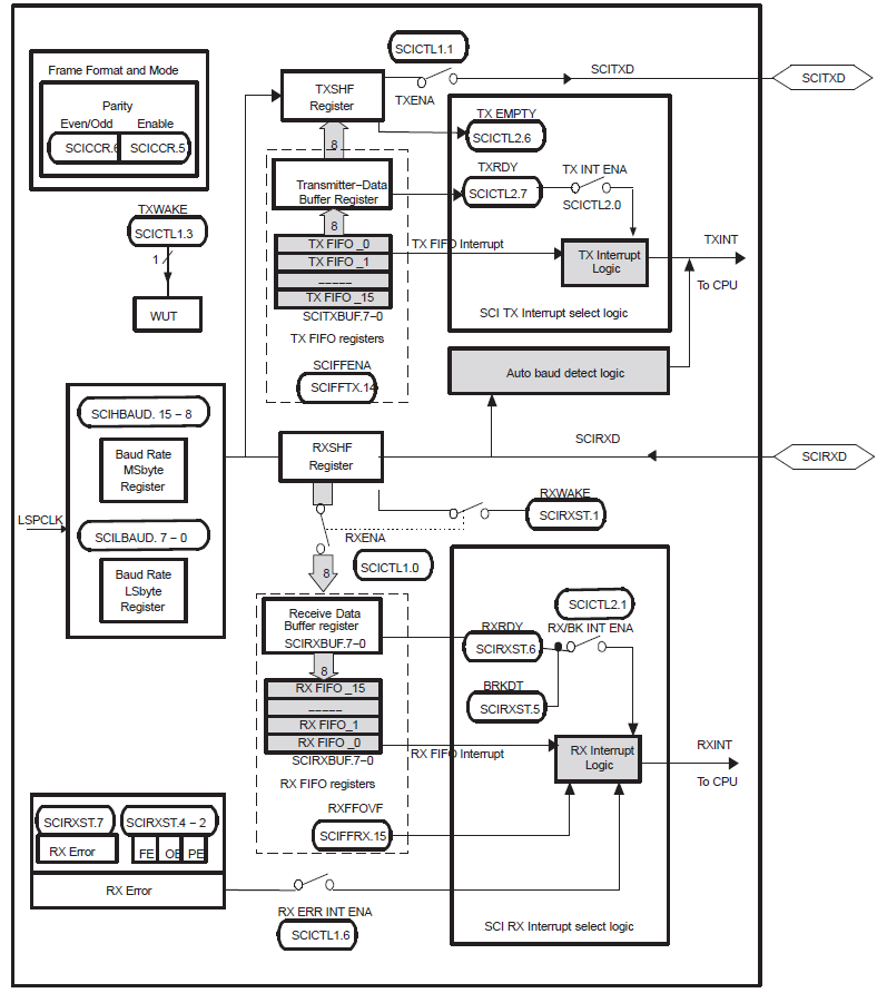 - SCI接收完整帧并将RXSHF寄存器中的数据传送到SCIRXBUF寄存器。此操作设置RXRDY标志(SCIRXST,位6)并启动中断。