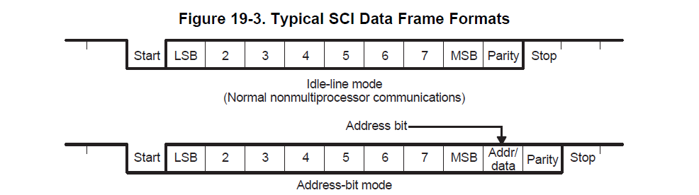 接收和发送的SCI数据采用NRZ(非归零)格式。 NRZ数据格式如图19-3所示,包括:
