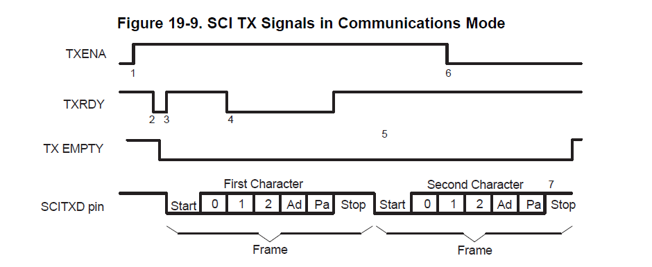 2. SCITXBUF写入;因此,(1)发射机不再为空,(2)TXRDY变低。