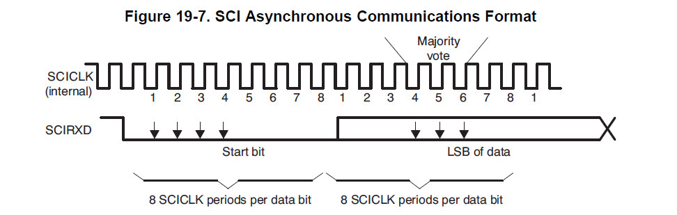 对于起始位之后的位,处理器通过在位中间产生三个样本来确定位值。这些采样发生在第四,第五和第六SCICLK周期,并且位值确定基于多数(三分之二)。图19-7说明了此异步通信格式,其中一个起始位显示了多数表决的位置。