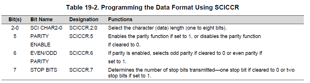要编程数据格式,请使用SCICCR寄存器。 用于编程数据格式的位如表19-2所示。