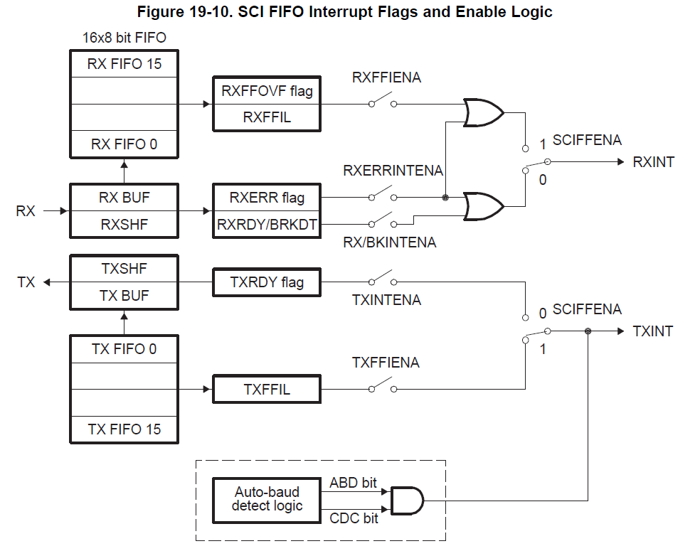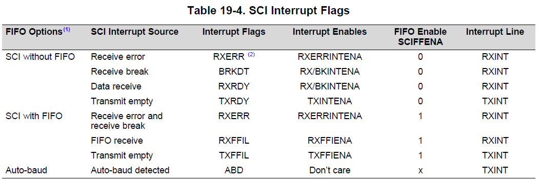 图19-10和表19-4说明了nonFIFO / FFO模式下SCI中断的操作/配置。