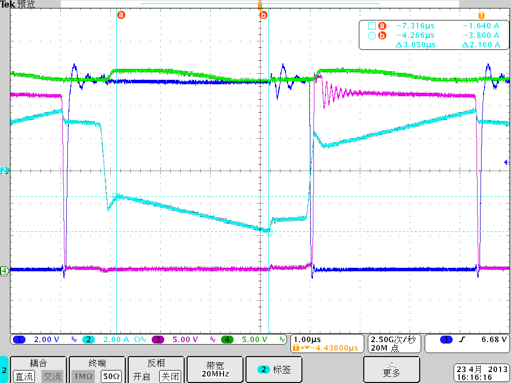 下图ch2-电流波形在lead leg关闭瞬间会有一个电流很大的凹坑:
