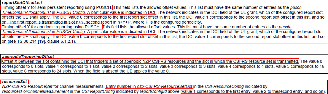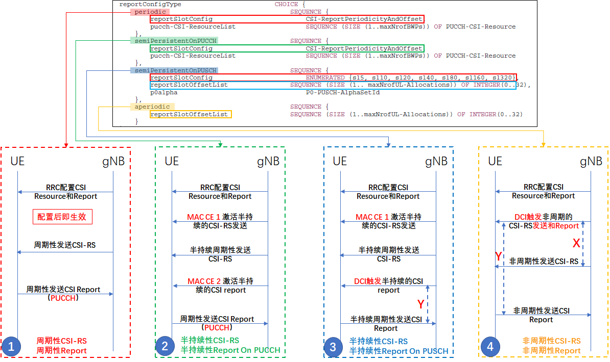 1)周期性上报:RRC配置好周期性的CSI-RS Resource和Report参数后,就会立即生效,无需MAC-CE/DCI去激活或者触发CSI-RS的发送和CSI的上报,CSI上报的周期和slotOffset按照参数reportSlotConfig配置的执行;