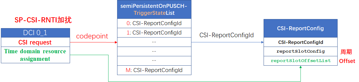 3)半持续性上报On Pusch:假设RRC配置了半持续的CSI-RS发送,首先需要MAC CE1激活CSI-RS的发送,然后再通过DCI触发CSI的report;如果RRC配置的是周期性的CSI-RS,则无需MAC CE1这一步;这里对于DCI多说两句,首先是DCI 0_1,使用SP-CSI-RNTI加扰的,其次DCI中两个field很重要,第一个是CSI request,通过codepoint的设置来关联对应的TriggerState,TriggerState里面会定义关联的CSI-ReportConfig,然后里面可以找到这个report相关的CSI-RS resource Config以及report的周期和OffsetList。其中周期是通过reportSlotConfig直接给出的,OffsetList是通过reportSlotOffsetList参数定义的,这是一个List,还需要通过DCI中的Time domain resource assignment这个field的codepoint取值再去关联List中的值,例如codepoint是0,就取OffsetList中的第一个值,如果是1,就取第二个值,依次类推;假设这个值是Y,也就意味着距离DCI后面第Y个slot发送CSI Report;