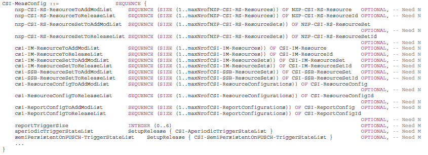 CSI框架基本配置两个东西,一个是用于配置CSI测量的CSI-RS资源,另一个是配置CSI如何上报。如何看CSI-MeasConfig呢?从两个重要的IE着手: