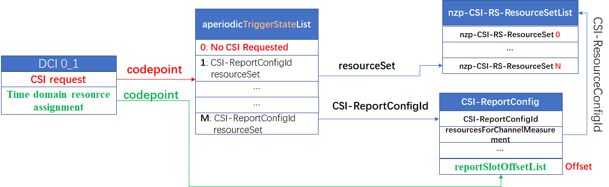 4) 非周期性上报:这里我们来讨论下最复杂的场景,非周期CSI-RS发送+非周期CSI上报。可以说对于此场景,非周期的CSI-RS发送和非周期CSI的上报均由DCI来触发。过程与半持续上报类似,但又更复杂些。1)根据DCI 0_1中的CSI request field的codepoint去关联对应的TriggerState。这里注意一下,与半持续DCI触发不同,CSI request如果为0,代表不要求触发CSI-RS,只有非0,才一位置触发有效。2)关联到state后,可以得到两个重要的参数,第一个是CSI-ReportConfig,然后就可以找到对应的reportSlotOffsetList,因为是一个List,需要DCI中的time domain resource assignment field的codepoint值去确定List中唯一的一个Offset值,拿到了这个Offset值,就知道距离DCI后第几个slot发送CSI report。3)关联到state后,得到的第二个参数是resourceSet,注意这个resourceSet并不能直接去对应CSI-measConfig中的resourceSet ID。在第二步中,通过CSI-ReportConfigId,还可以得到关联的CSI-ResourceConfigId,而CSI-ResourceConfigId关联的是一个resourceSetList,又是List,这时候需要resourceSet的值去确定List中唯一的resource Set。