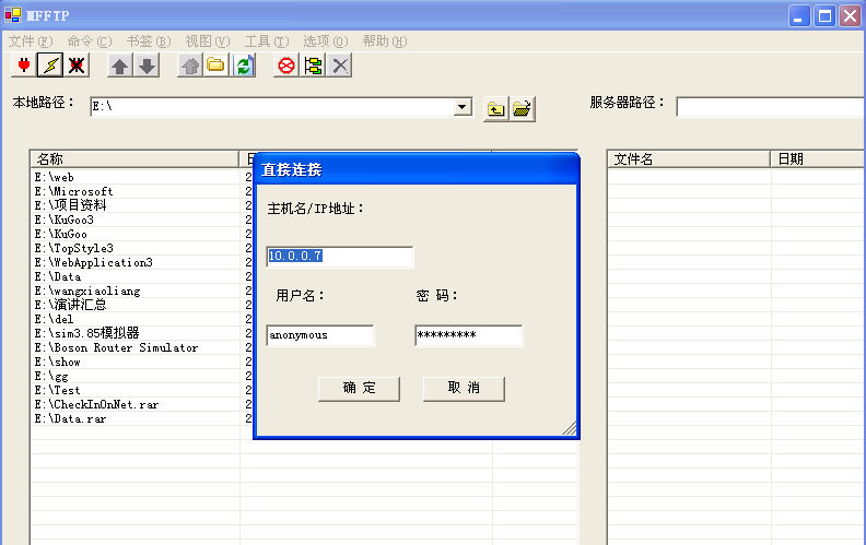 第一步测试的是连接操作。连接一般有两种情况,一种是连接他是用户经常用要访问的FTP服务器,需要进行保存登录信息的。另一种是不常访问只是偶尔访问一下的只需要当次连接的是快速连接。连接前如下图4,输入IP地址为10.0.0.7(IP为本机地址);以及用户名密码为“anonymous”,连接成功后如图5。