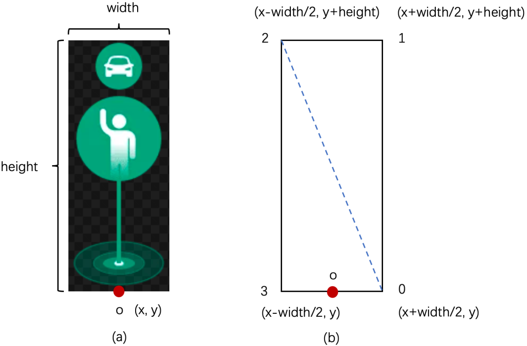图(a)中o点是根据传过来的经纬度转换成的地图中的坐标。数据是以一组经纬度来代表订单生成的位置,我们要在这个位置显示气泡,webgl中是以一个三角形片元绘制各种图形,矩形至少需要两个三角形片元,6个顶点,除去可以共用的顶点,我们至少要知道图(b)中0、1、2、3四个顶点的坐标。如图所示,我们将经纬度对应的点作为矩形底边的中点,结合图片的宽高即可得到0、1、2、3四个点的坐标。