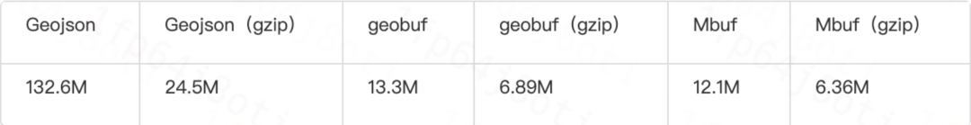 改良后的geobuf叫做mbuf,下面是一组对比数据:(注:geobuf和mbuf还剔除了一些不需要的属性,所以geobuf相比官方提供的测试数据压缩比更大,官方提供的数据中gzip后可压缩2-2.5倍)