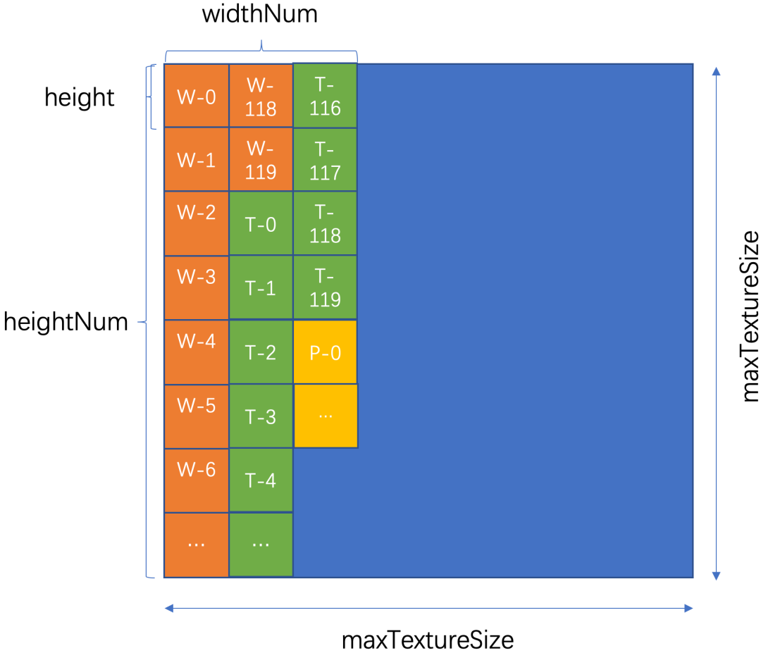 在绘制纹理画布时,我们采用列主序的方式,maxTextureSize对应的就是前面提到的单个纹理单元的最大限制,height代表每张图片的高度。首先计算一列最多容纳的图片数,然后根据总图片数picNum得到纹理单元的行数heightNum和列数widthNum,根据以上信息,我们就可以精确的得到第m种气泡类型的第n帧图片在纹理画布上的第几行第几列,从而映射到气泡所在的位置。