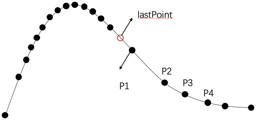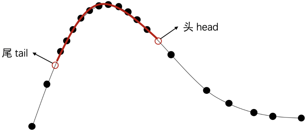 如何让轨迹动起来呢?其实就是每一帧都让轨迹沿着预设好的路线向前移动。设想轨迹有一个头和一个尾,每帧让头和尾都沿着路线移动固定的距离,再将头尾间的点连接起来即可。通常我们会用若干点来描绘一条路径(下面我们称这些点为路径点,即下图所示的实心点),点在路径上并不是均匀分布的,在转弯的地方会比较密集,直线的地方相对稀疏。所以在确认好头尾点的位置后,还需要将头尾点与中间的路径点串联起来,才是我们最终需要绘制的轨迹。如下图所示,红色曲线是需要绘制的部分。