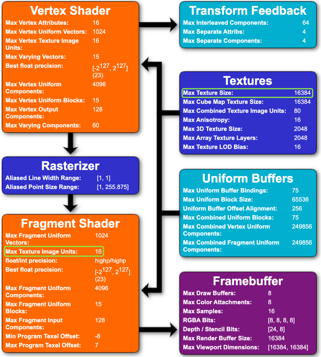 上图展示了着色器的相关限制,与纹理相关的部分限制了片元着色器的纹理单元数量不超过16个,这就意味着如果我们将每个气泡单独绘制在一个canvas上,至多只能绘制16种类型的气泡,当然这对于我们当前的业务场景也是够用的,但是容量天花板相对较低。假设我们一个纹理单元绘制两种气泡,最多可绘制32种,以此类推。同时需要注意一下单个纹理单元的最大限制是16384,假设一张图片的大小是200*200,那么一个纹理单元最多容纳6561张图片。如果我们绘制的范围超过该限制,即要添加新的纹理单元,所以要注意边界判断。