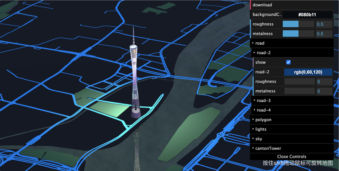 上图为北京屏的设计稿。设计稿是一张二维的图片,需要将此二维图片还原到3d场景,但是二维可以设置的参数与三维完全不一致,例如三维中通常需要设置材质、光线的属性,而这些参数二维中是没有的,因此一开始只能凭经验靠感觉来调整。但是对于开发来说,如何恰到好处的把各个参数调整到位是一件非常头疼的事情,而且很难精准的达到设计师想要的效果。问题不好解决,沟通成本也很高,不如一劳永逸,开发一个工具给设计师调整,于是就有了map3中的configer工具。通过可视化的调试面板,让设计师通过调整参数来还原场景效果,在附加上一键导出所有配置参数的功能,保留配置并直接应用在map3中,这一切就变得简单了许多。