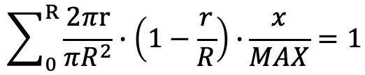 假设以方圆R范围作为统计单位,如果这个圆都显示红色,那么其透明度的叠加值要为1。点模版是一个渐变圆,圆心处透明度为1代表不透明,边缘处透明度为0代表完全透明。此外还有最大订单量设定的影响,假设我们将最大订单量设为MAX=10,那么每个点模版透明度的最大值即为0.1,所以点模版的透明度是从0~1/MAX变化的,不是从0~1变化的。设方圆R范围内的累计透明度为1所需要的订单量为x单,则有: