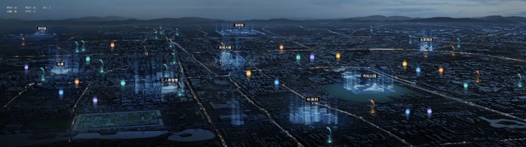 以北京为例,我们对整个北京市进行了建模,包括道路、水系、建筑等,此外还对10余个地标性建筑进行了精细处理,例如望京SOHO、CCTV、故宫、工人体育馆、中关村等是以精模形式展现在地图上。总体以较为沉浸式的感官体验进行展示,通过轨迹、订单位置和订单热力等对滴滴的业务进行了实时的可视化展示。