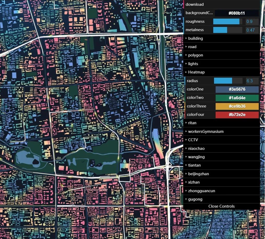 热力图展示了以此时刻开始,过去一段时间内北京城的订单分布情况。我们将获取到的订单数据生成热力图并映射到建筑顶层,更加直观准确且及时的展示了全城订单分布。目前热力图可配置项包括: