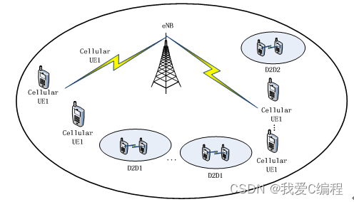考虑下行链路的蜂窝网络中存在多个D2D通信对和多个蜂窝用户,它们共享相同的频率资源并且蜂窝用户为主用户。