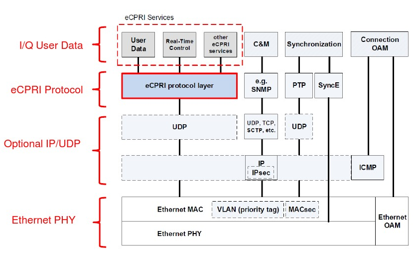 虽然上述接口是以太网,但以太网之上承载的High-PHY与Low-PHY交换的数据格式却是5G新定义的。eCPRI就在诞生在这里。