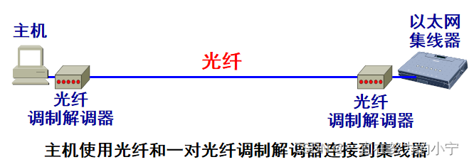 主机使用光纤(通常是一对光纤)和一对光纤调制解调器连接到集线器。