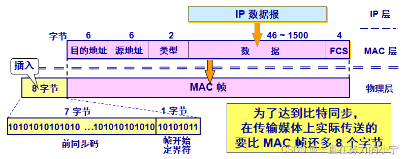 在帧的前面插入(硬件生成)的 8 字节中,第一个字段共 7 个字节,是前同步码,用来迅速实现 MAC 帧的比特同步。第二个字段 1 个字节是帧开始定界符,表示后面的信息就是 MAC 帧。