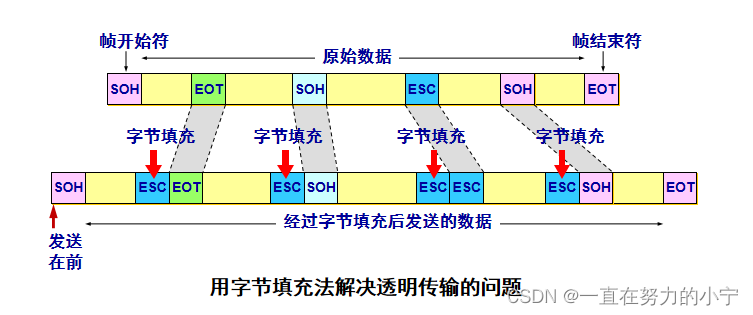 解决透明传输问题:字节填充 (byte stuffing) 或字符填充 (character stuffing)