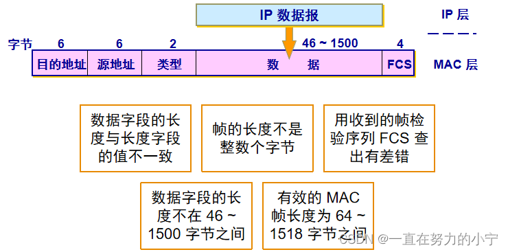 数据字段 46 ~ 1500 字节,正式名称是 MAC 客户数据字段, 最小长度 64 字节 - 18 字节的首部和尾部 = 数据字段的最小长度(46字节) 当数据字段的长度小于 46 字节时, 应在数据字段的后面加入整数字节的填充字段, 以保证以太网的 MAC 帧长不小于 64 字节。