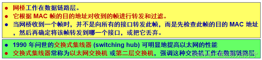 ③ 交换机和集线器(或转发器)不同:集线器在转发帧时,不对传输媒体进行检测;交换机在转发帧之前必须执行 CSMA/CD 算法;若在发送过程中出现碰撞,就必须停止发送和进行退避。