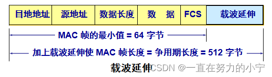 使最短帧长仍为 64 字节(这样可以保持兼容性),同时将争用时间增大为 512 字节。 凡发送的 MAC 帧长不足 512 字节时,就用一些特殊字符填充在帧的后面,使MAC 帧的发送长度增大到 512 字节。接收端在收到以太网的 MAC 帧后,要将所填充的特殊字符删除后才向高层交付。