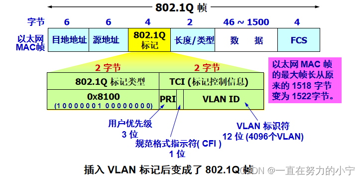 插入 VLAN 标记得出的帧称为 802.1Q 帧 或 带标记的以太网帧。
