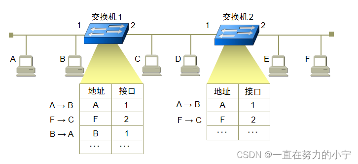 转发帧:查找交换表中与收到帧的目的地址有无相匹配的项目; 如没有,则向所有其他接口(进入的接口除外)转发; 如有,则按交换表中给出的接口进行转发; 若交换表中接口就是进入交换机的接口,则应丢弃这个帧(因为不需要经过交换机进行转发)