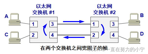 离开交换机 #1 的接口 3 → 交换机 #2 的接口 1 → 接口 2 → 交换机 #1 的接口 4 → 接口 3 → 交换机 #2 的接口 1 →……。这样就无限制地循环兜圈子下去,白白消耗了网络资源。