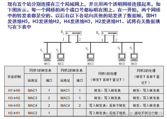 按照以下自学习算法 处理收到的帧和建立转发表:若从 A 发出的帧从接口 x 进入了某网桥,那么从这个接口出发沿相反方向一定可把一个帧传送到 A。 网桥每收到一个帧,就记下其源地址和进入网桥的接口,作为转发表中的一个项目。 在建立转发表时是把帧首部中的源地址写在“地址”这一栏的下面。 在转发帧时,则是根据收到的帧首部中的目的地址来转发的。这时就把在“地址”栏下面已经记下的源地址当作目的地址,而把记下的进入接口当作转发接口。
