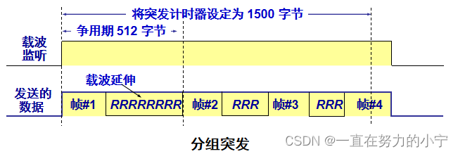 当很多短帧要发送时,第一个短帧要采用载波延伸方法进行填充,随后的一些短帧则可一个接一个地发送,只需留有必要的帧间最小间隔即可。这样就形成可一串分组的突发,直到达到 1500 字节或稍多一些为止。