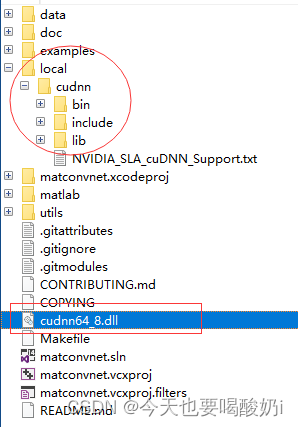 (3)在matconvnet-1.0-beta25(建议重命名文件夹改为matconvnet)中建一个local文件夹(与example和matlab等同一”级别”),然后把下载的cudnn放进去,文件名一定要重命名成cudnn,如下图所示: