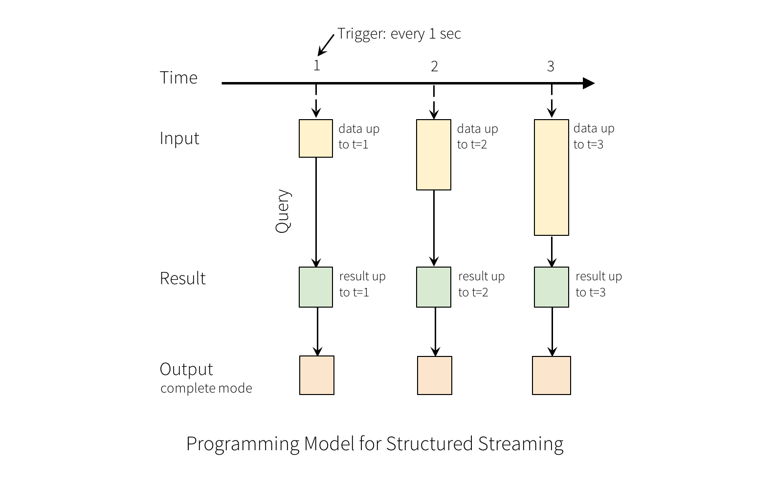 每一条查询的操作都会产生一个结果集-Result Table。每一个触发间隔(比如说1秒),当新的数据新增到表中,都会最终更新Result Table。无论何时结果集发生了更新,我们都能将变化的结果写入一个外部的存储系统。
